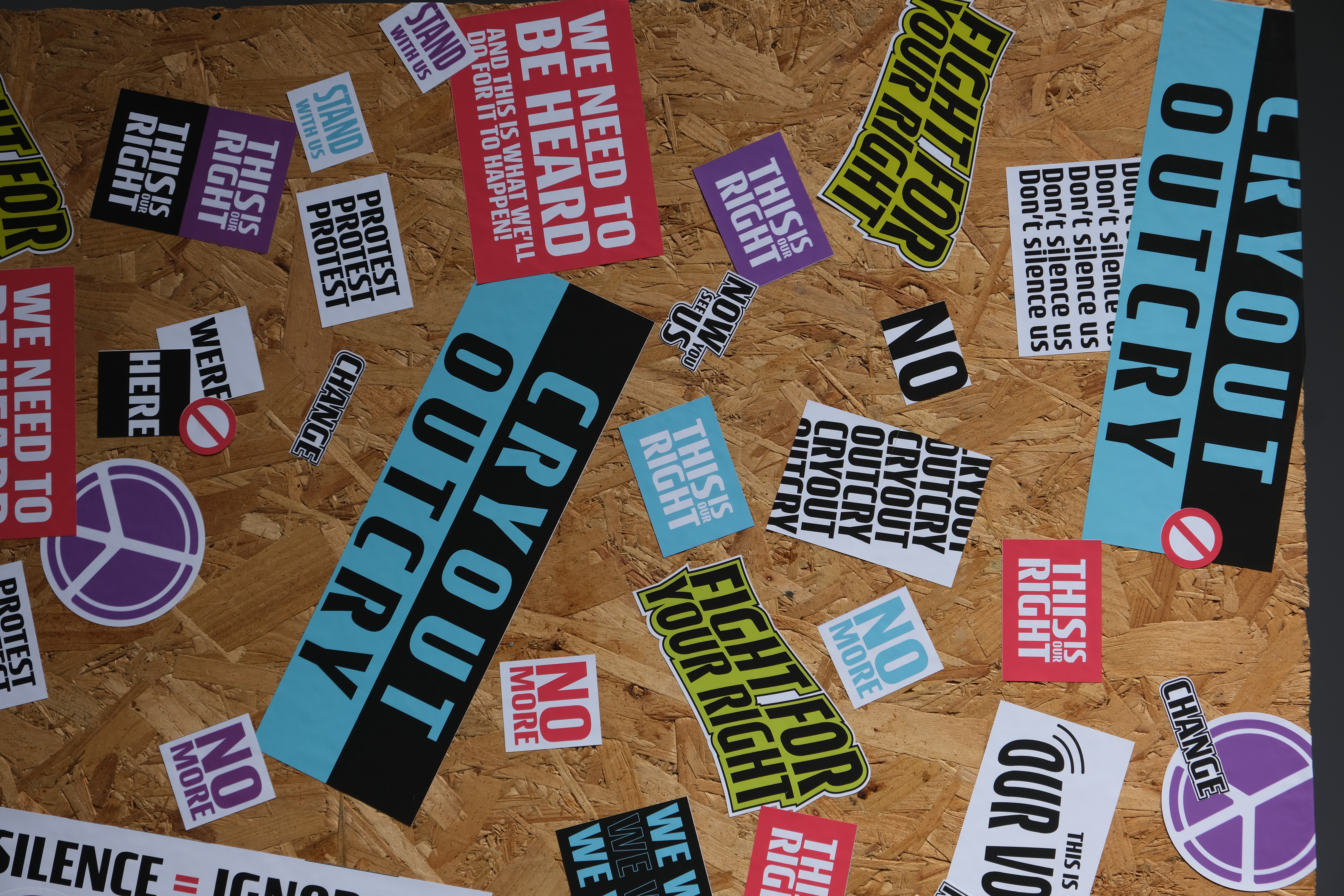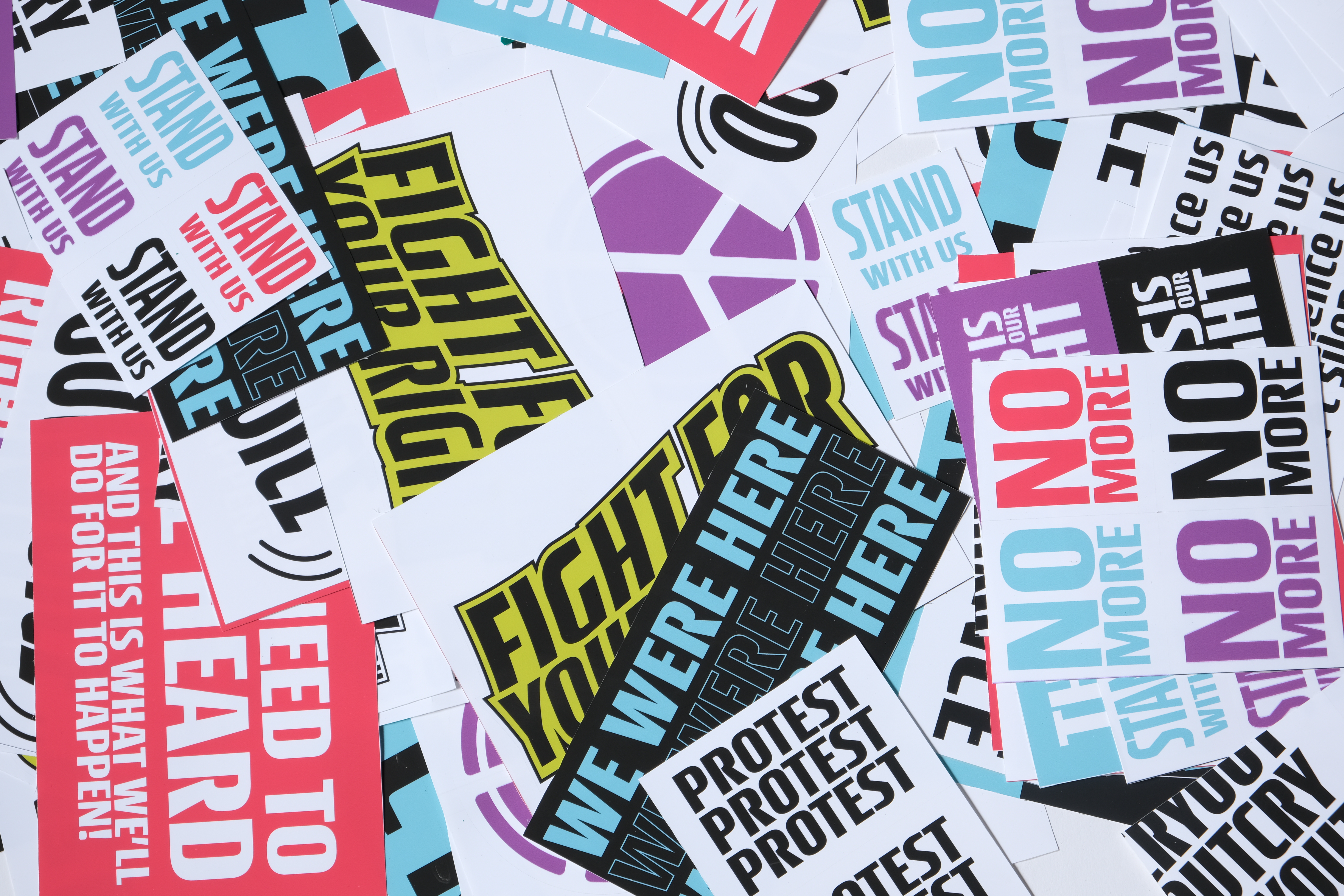 The stickers themselves only being designed with two consistencies in mind, the colour and the font, but the layout and designs could vary as much as was seen fit. This was to create variety in the designs but keep them feeling as part of the same set. I wanted these to be general use protest stickers as to not limit their use to just one kind of protest and the messages included can then be interpreted in different ways.