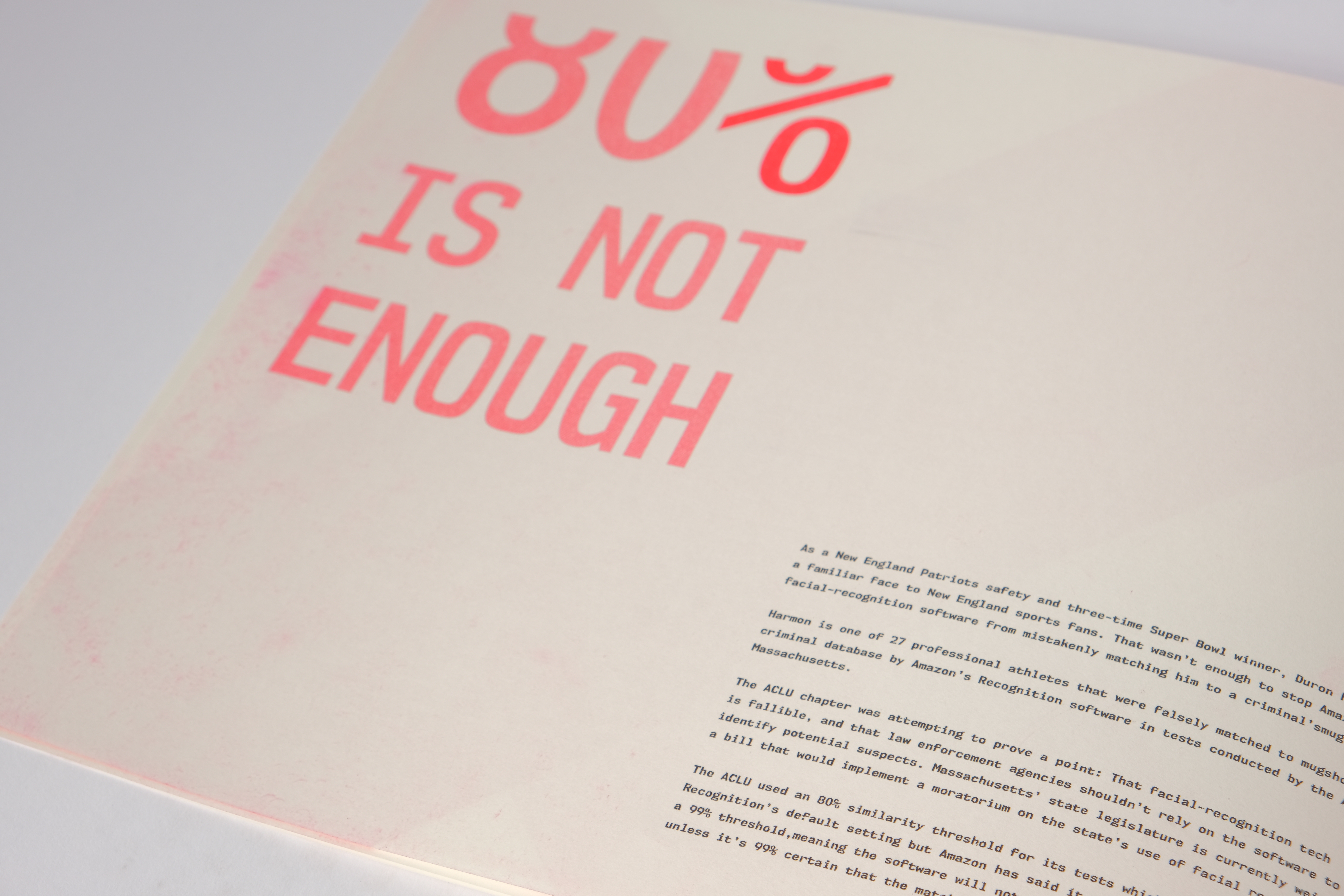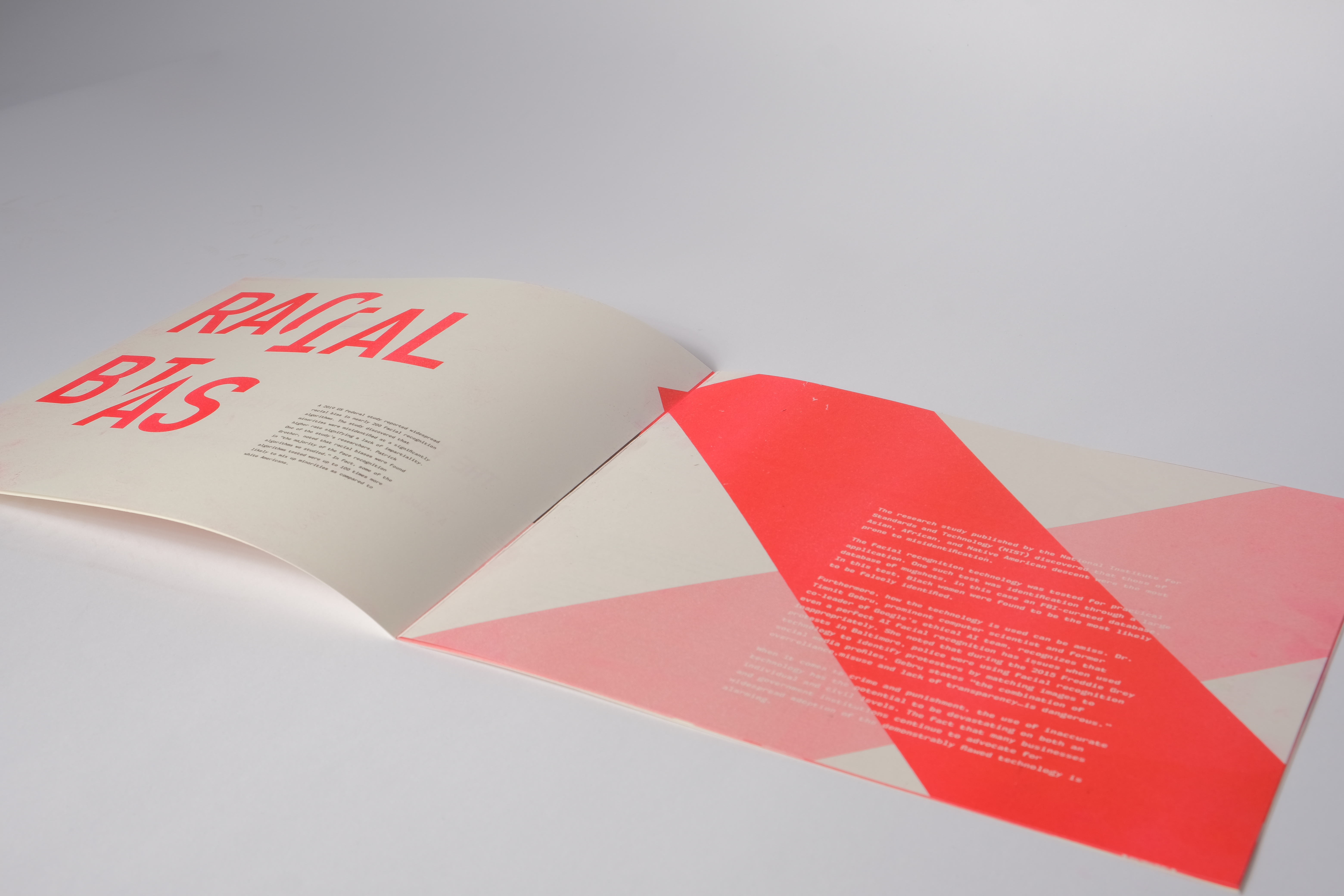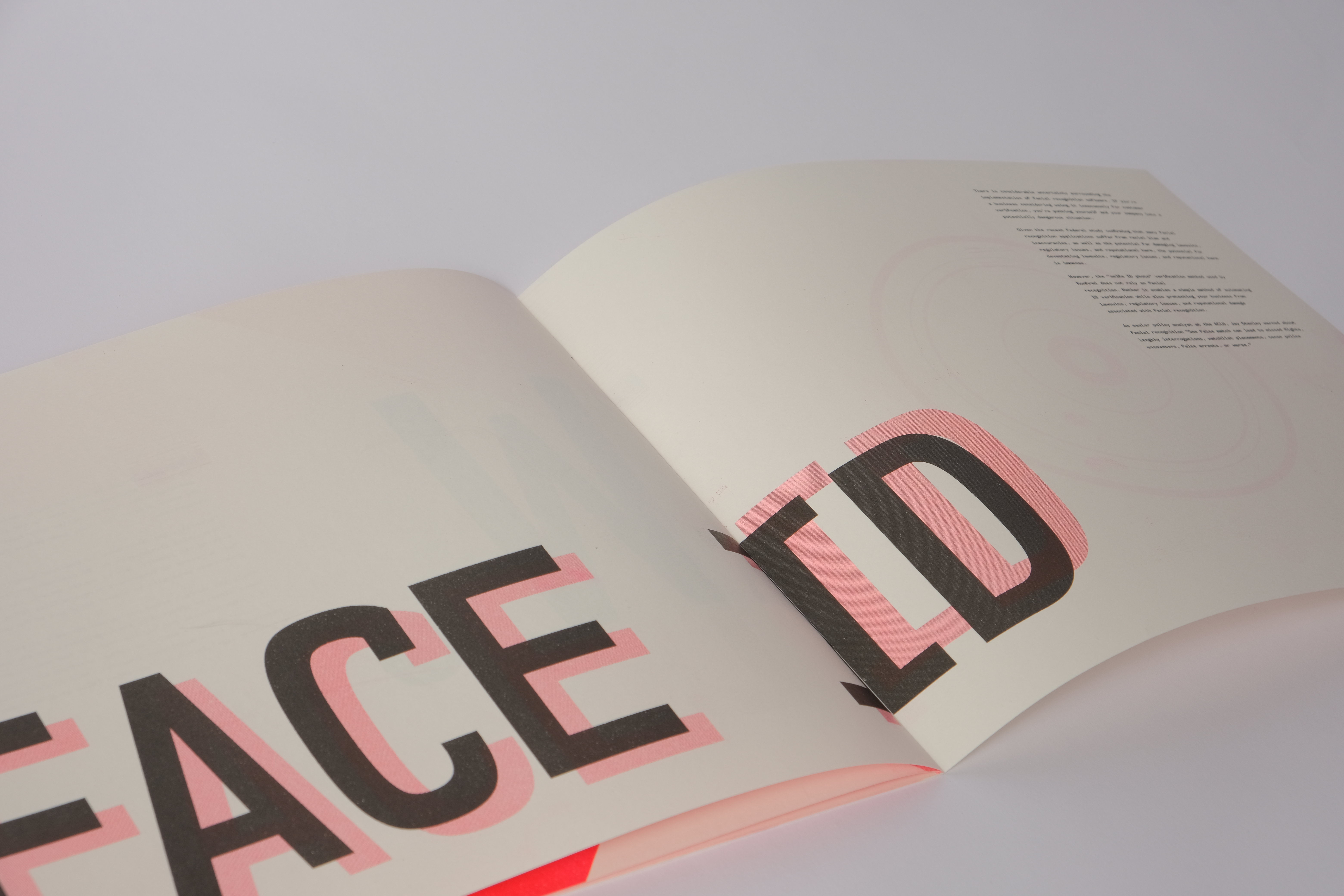 Each spread designed to focus on a single issue with facial recognition, including a combination of typography and illustration to make each page unique and relevant to the topic on focus while still being able to be interpreted in different ways.