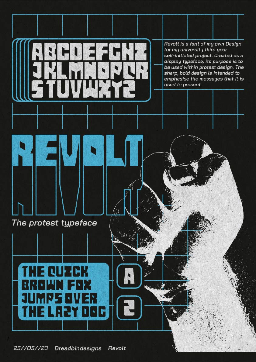 A simple visual created to give life to the “Revolt” font created for my self initiated work during my third year of Uni.