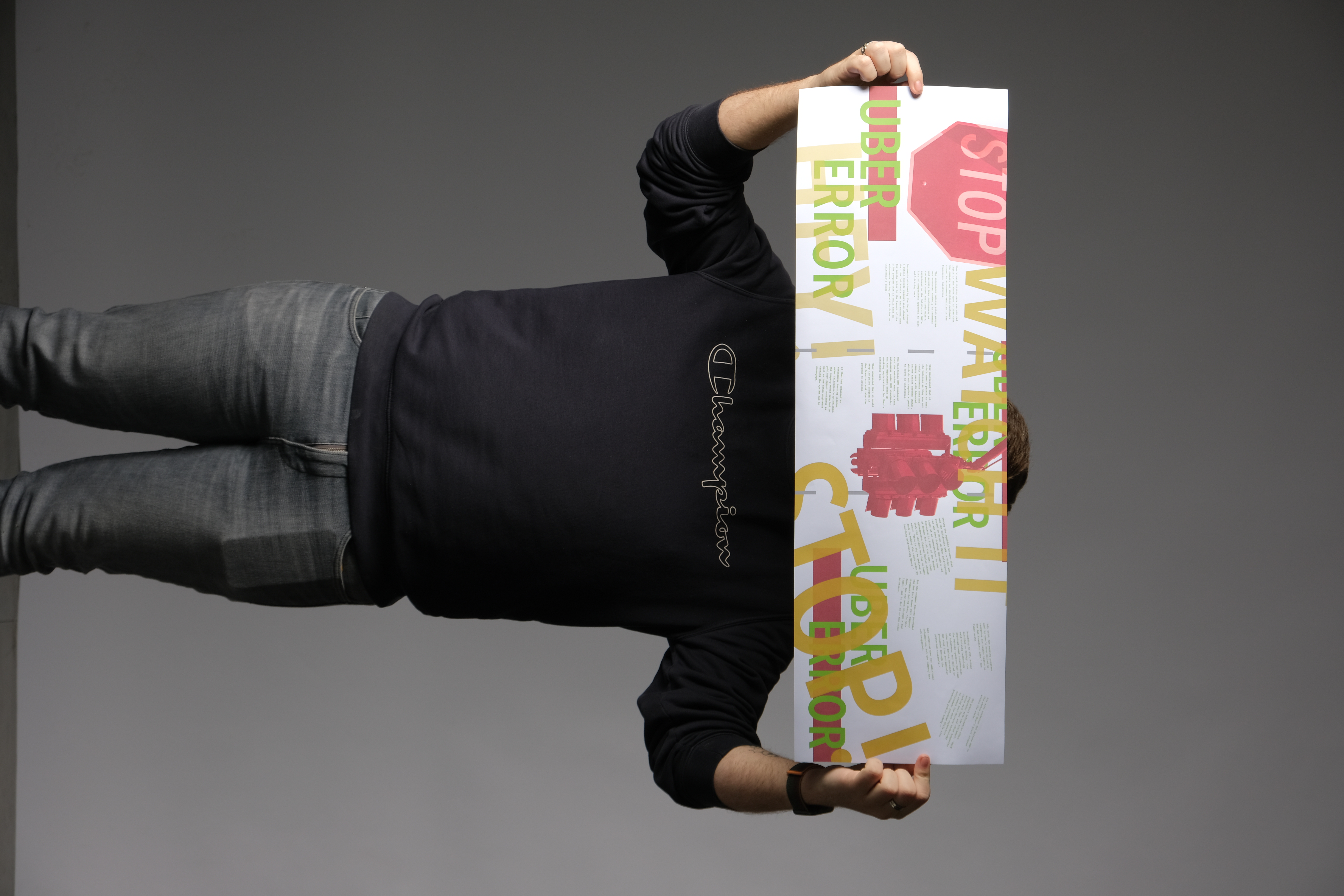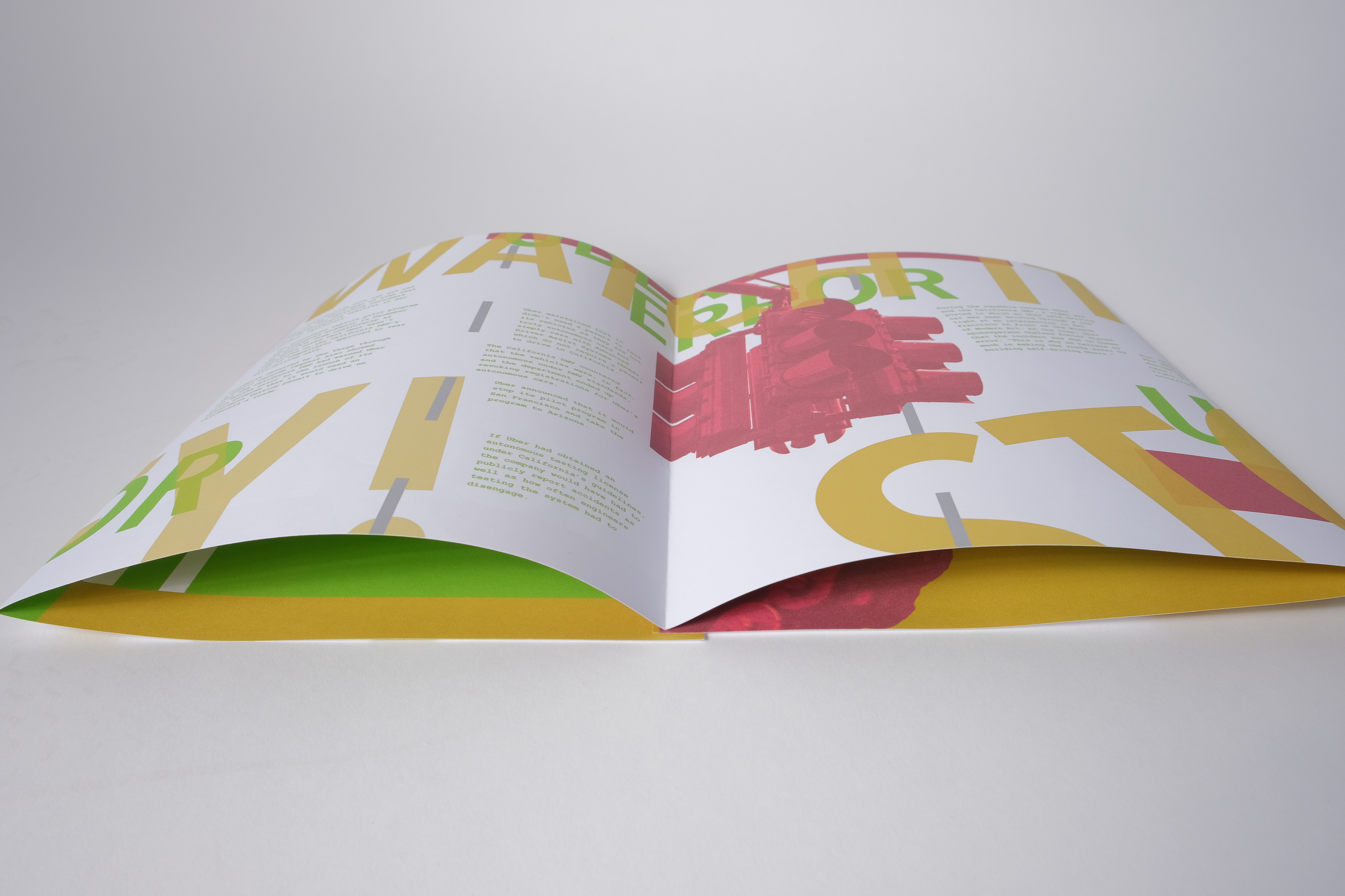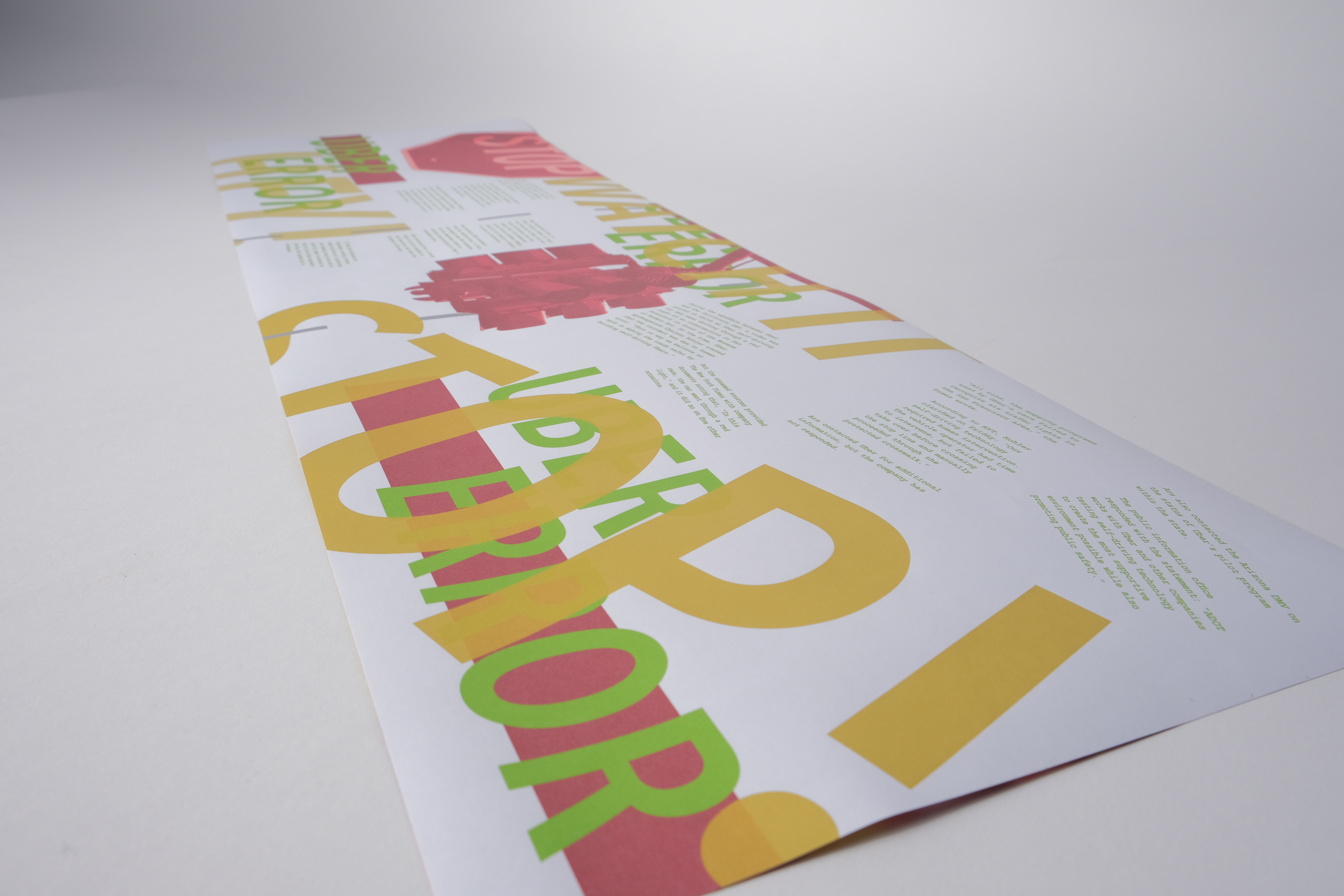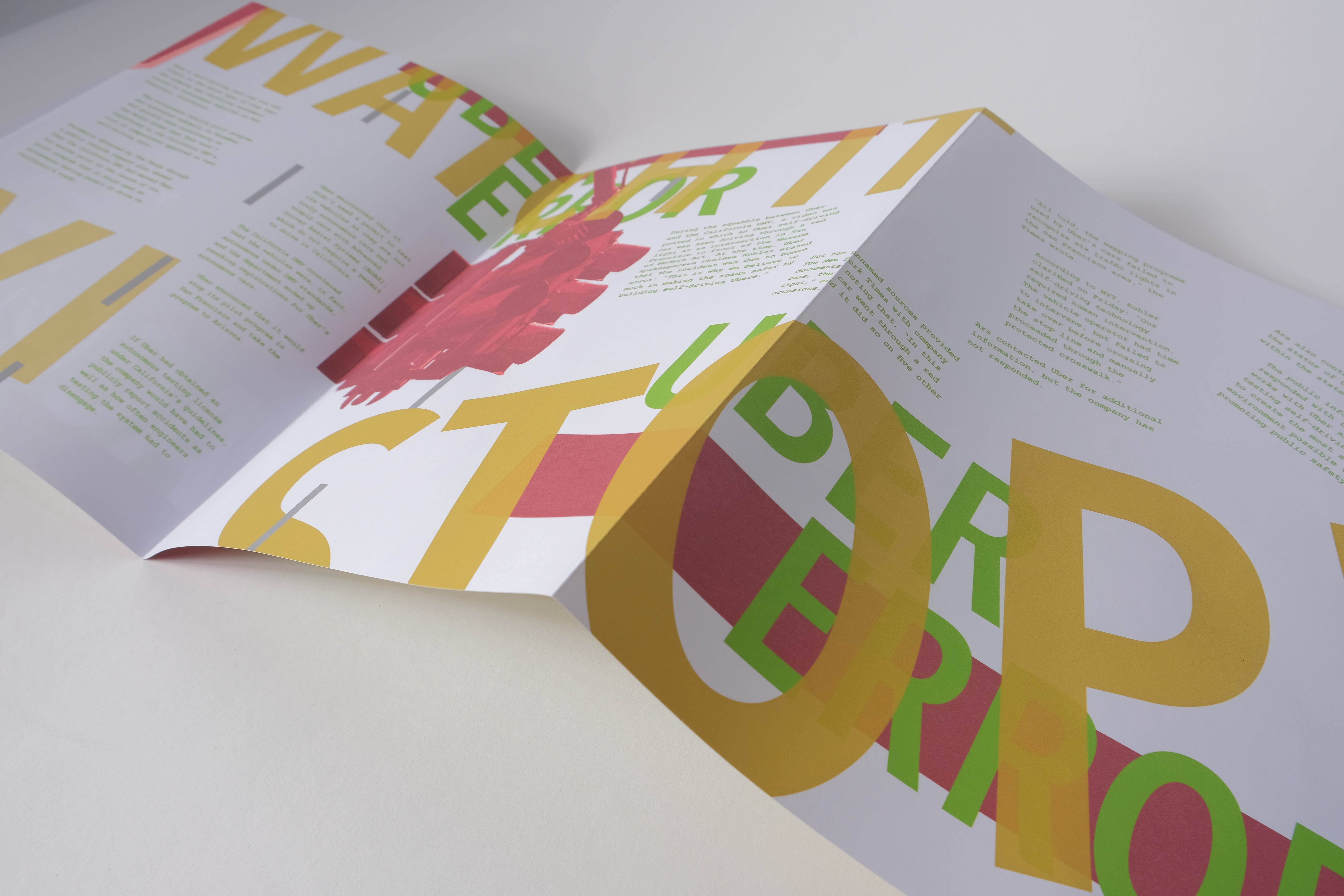 Each side is designed to reflect the story being told and the piece as a whole takes heavy inspiration from the design styles of Wolfgang Weingart, using large blocks and a seemingly random placement of text and design to leave the reader thinking of what each subtle design choice could be implying.