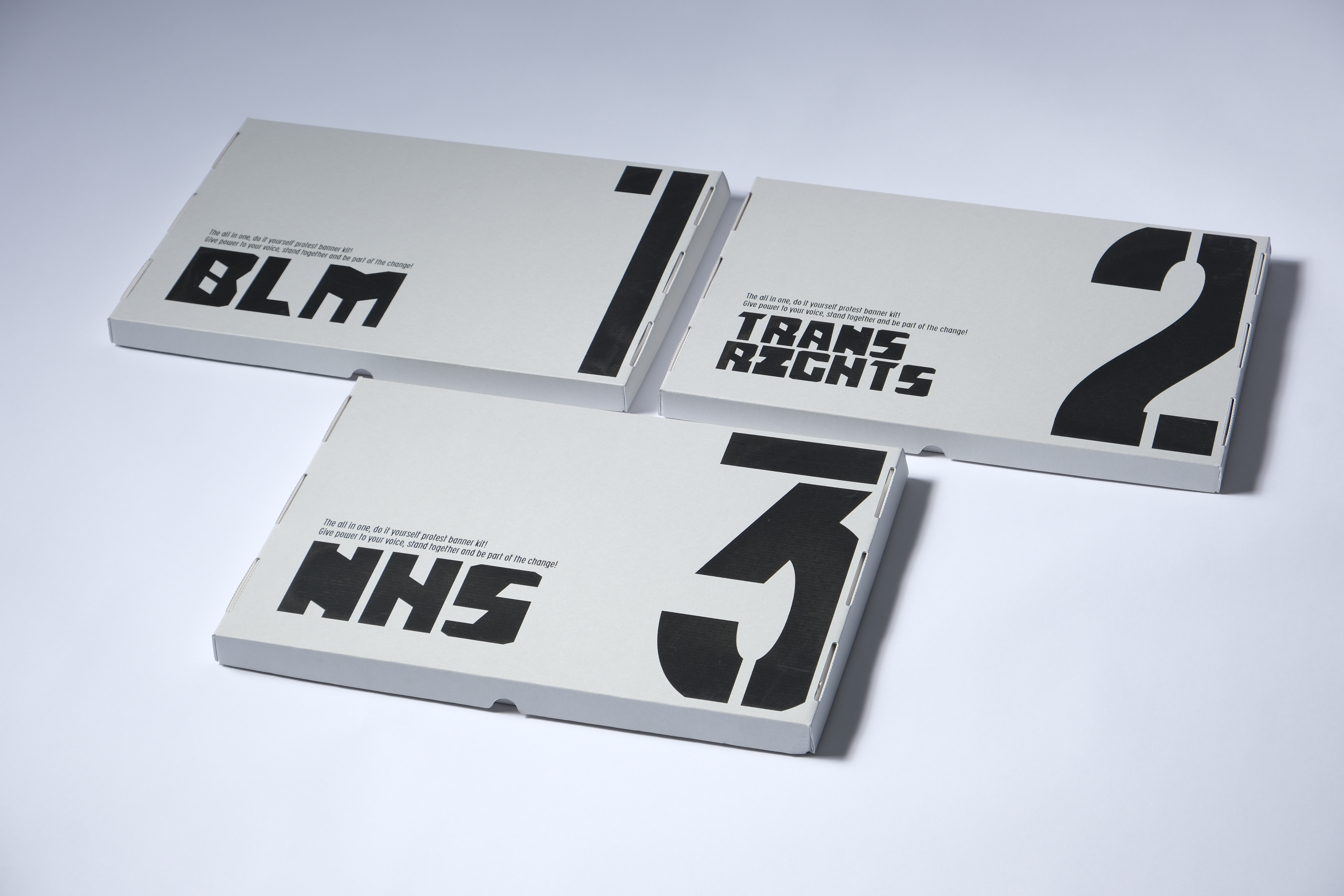 Designed to be a deliverable line of protest banner making kits, each would be tailored to a specific protest, these three are just examples of what an extended line could look like.