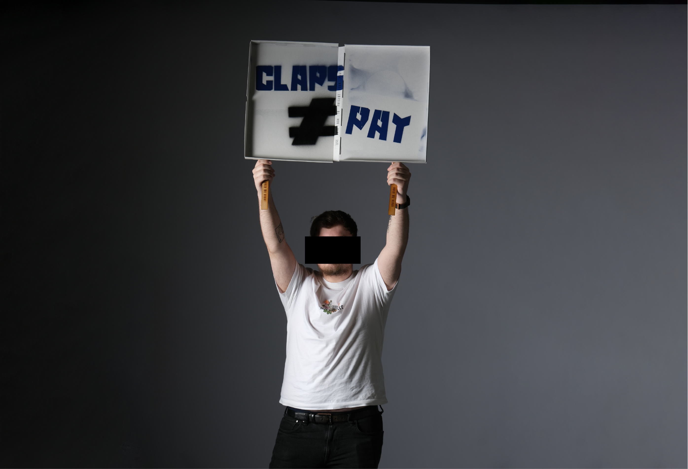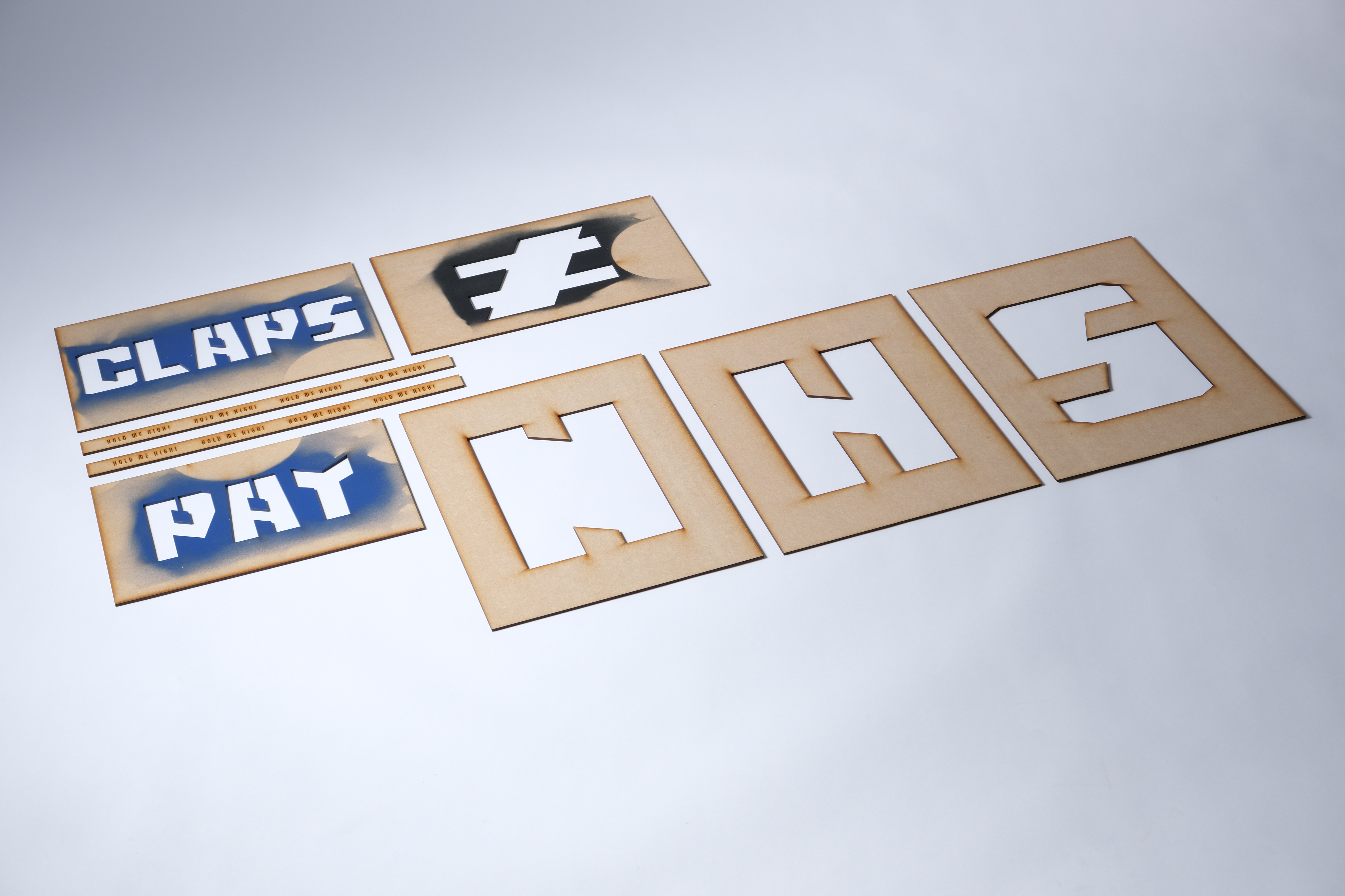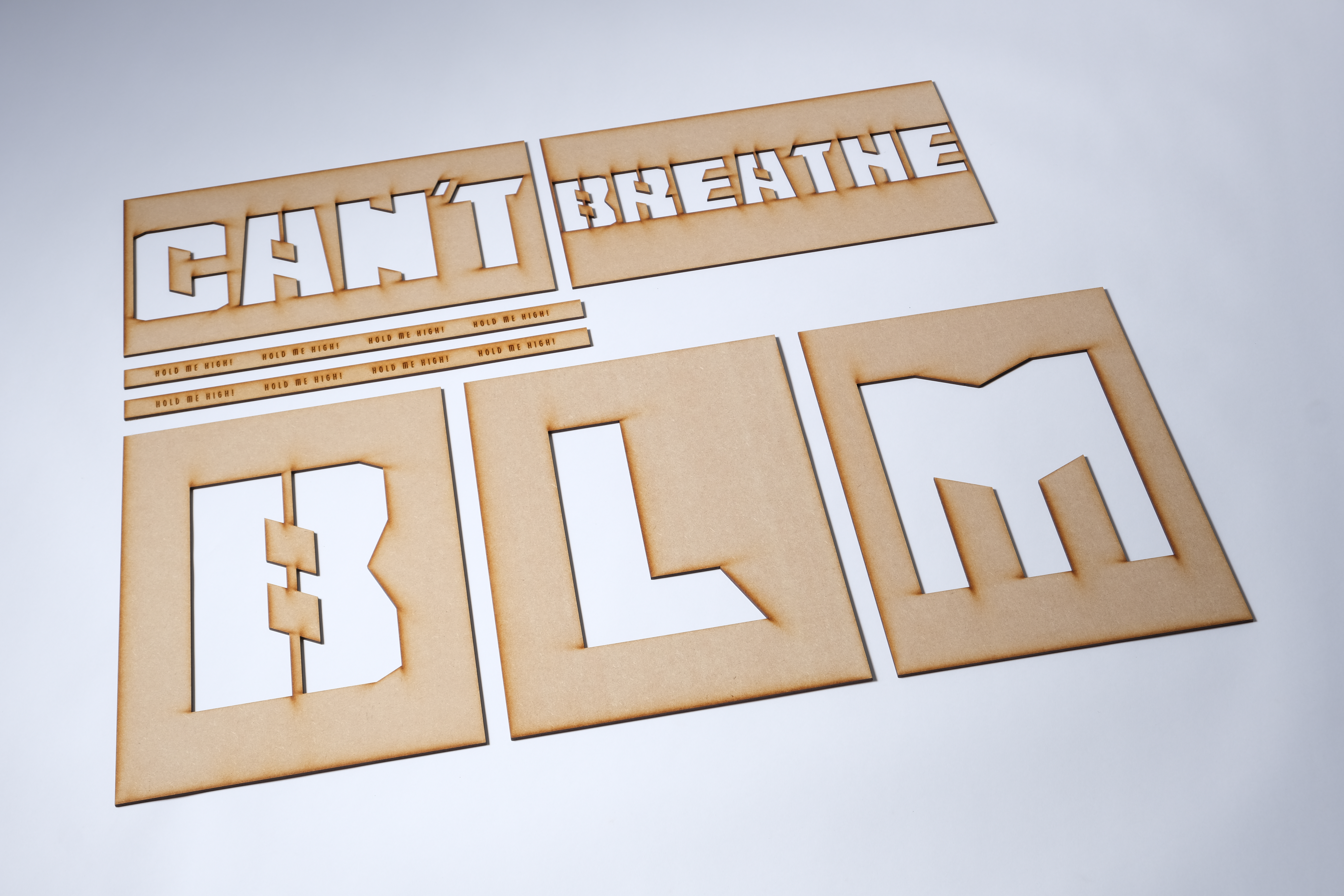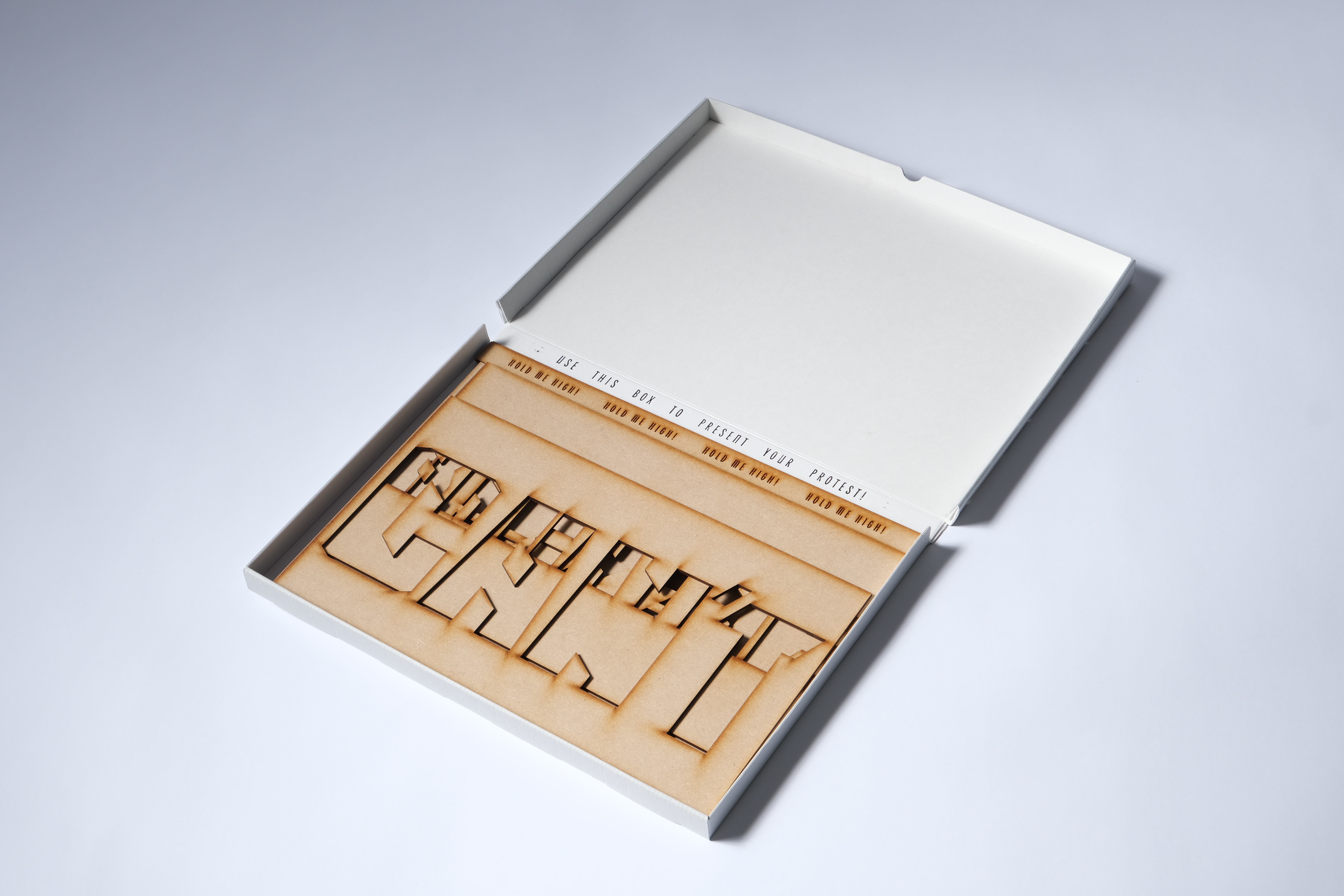 Each box contains a set of stencils using a custom designed font made by myself to specifically be used for protest material thanks to its bold, harsh shape. Each set of stencils were kept to a minimum so the messages could be as simple and as straight to the point as possible. A pair of engraved handles is also included. Everything outside of spray paint and tape is included in this set, including the box which is to be used as your banner so no part goes to waste.